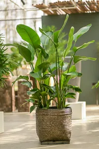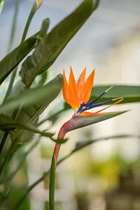 De klassieke bloeiende Strelitzia met de herkenbare oranje-blauwe bloem. Compacter van formaat en geschikt voor woonruimtes, hospitality en lichte werkplekken.
